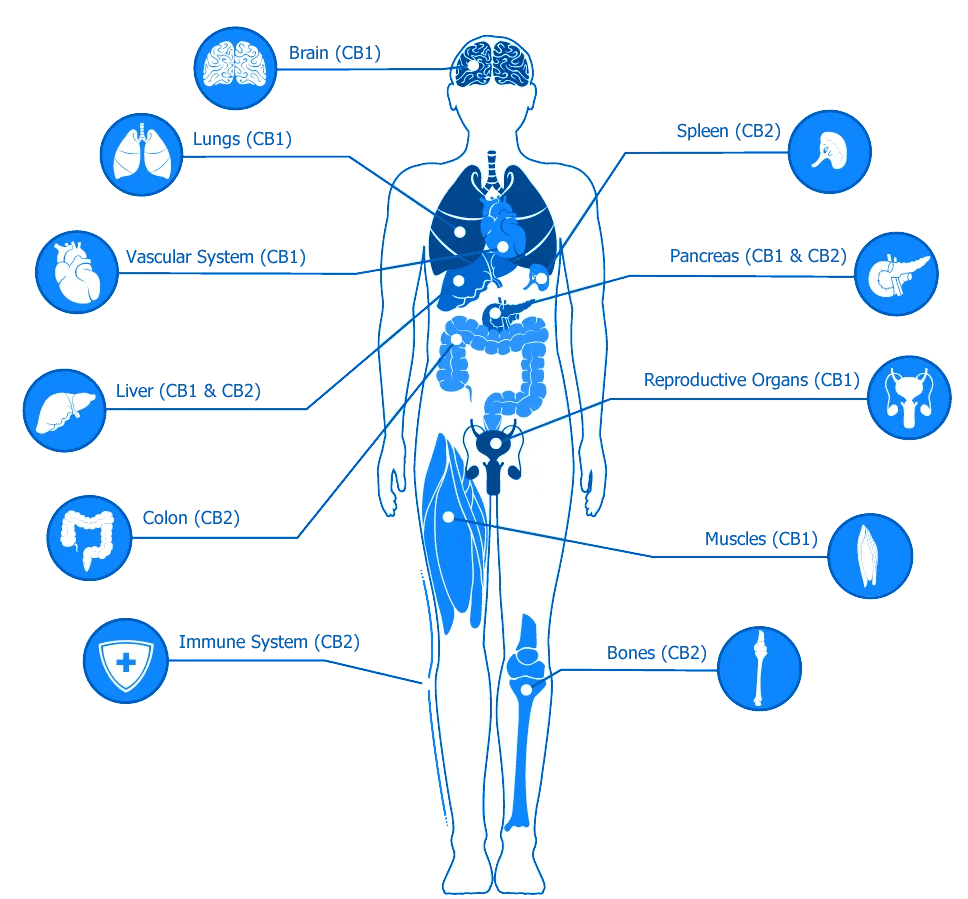 CB2-R are primarily associated with the immune system and are located outside the brain in places such as the intestines, spleen, liver, heart, kidneys, bones, blood vessels, lymph cells, endocrine glands, and reproductive organs. Until recently, it was believed that CB-2R did not play a role in nerve cells or bundles. However, studies now show that it also plays an important role in the brain’s signal processing.